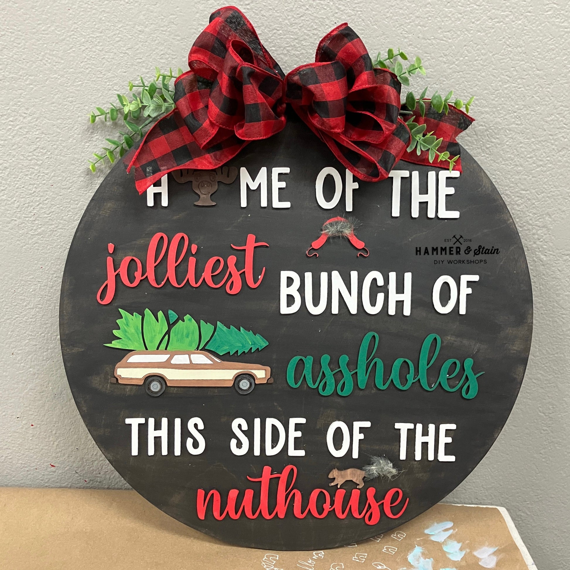 These door hangers have 3D pieces are about 16". Pictures are just examples of how you can paint your project. These projects do not come with bows or greenery but can be purchased at studio.