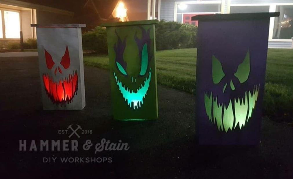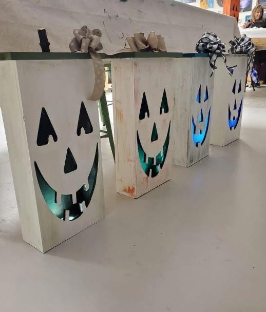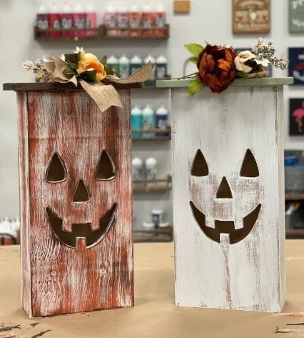 Make one of our unique and awesome GIANT Jack-O-Lanterns! The bottom is left out to place over a light source (light not included). Stem decor of raffia and ribbon are not included. This project includes all of the materials you need to make your sign with your choice of front face design!