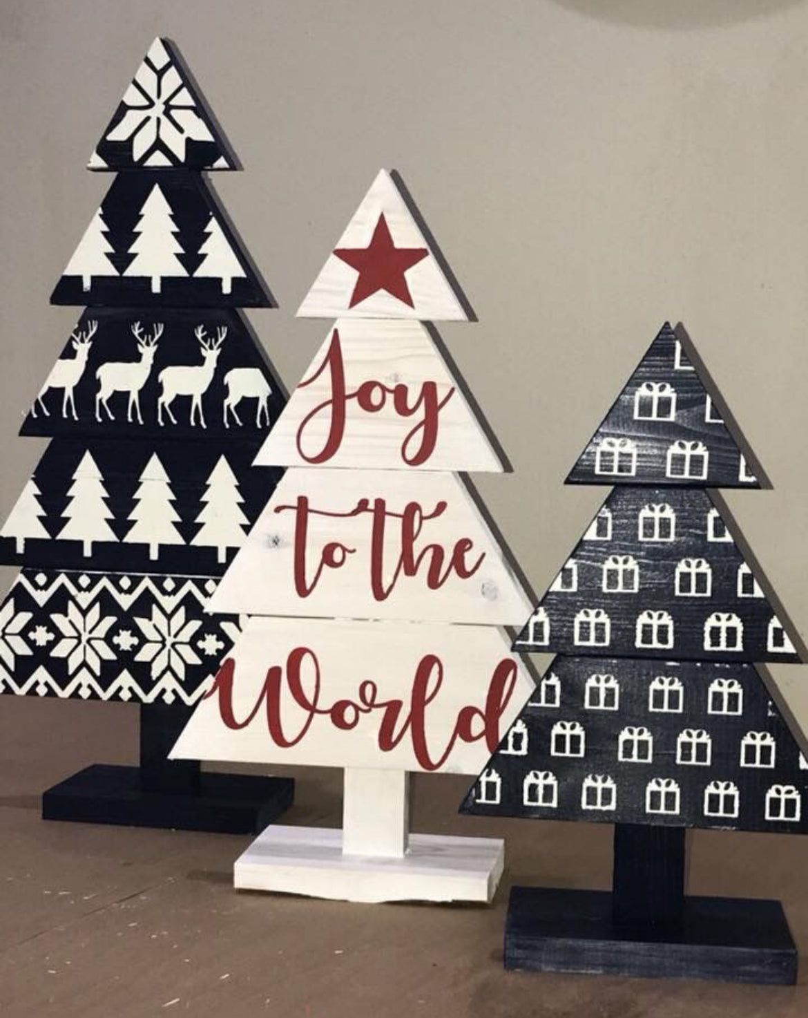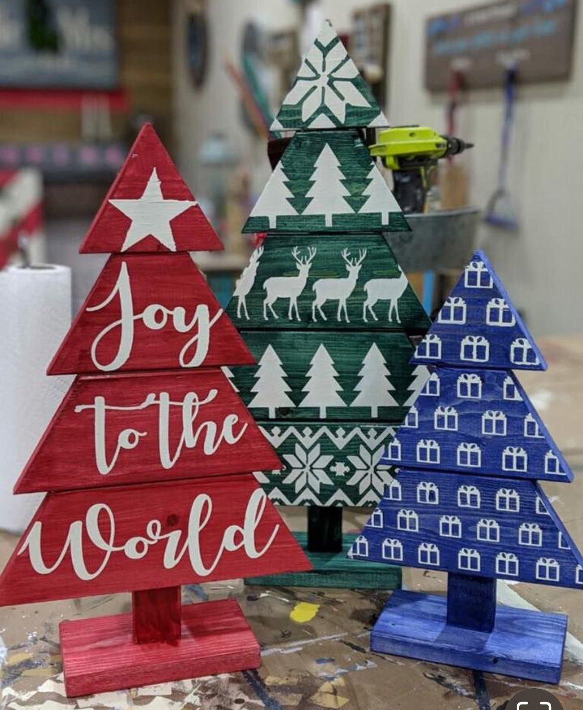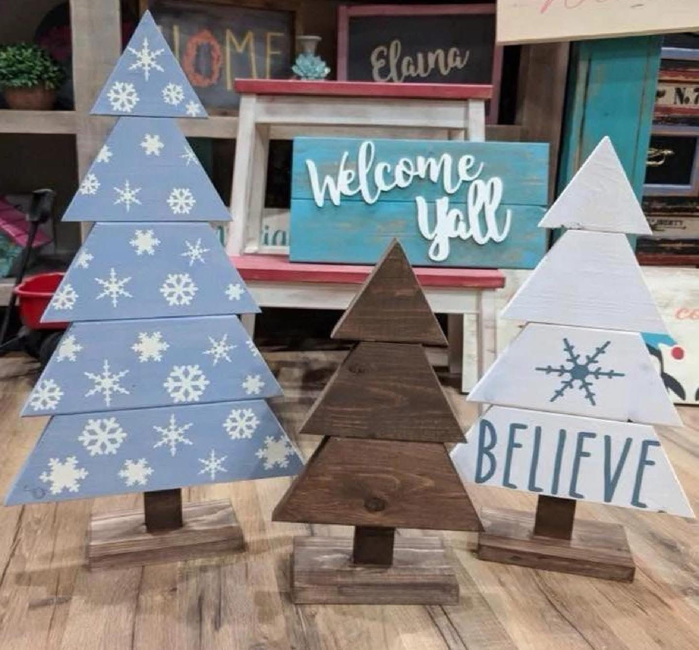 Join us December 4th @6pm at Hammer and Stain SoCal for this beautiful Christmas tree Trio workshop! Paint colors will be chosen at the studio during the event. Trees measure approx 21in, 17in and 13in tall. This registration will allow for one adult to make ALL three trees!