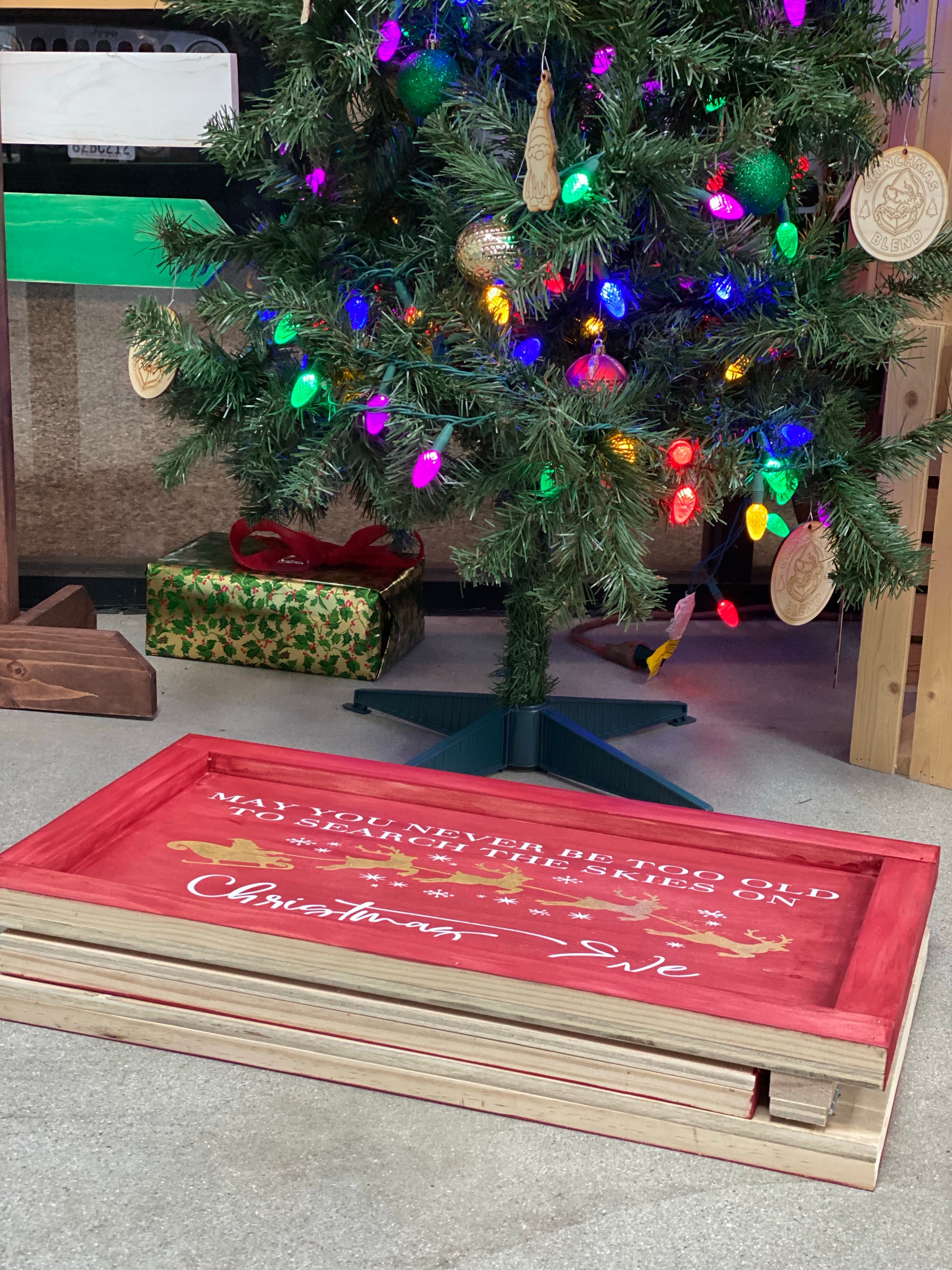 Boxes are 3 sided to slide under the tree with ease. Each side is hinged so it will fold up for easy storage after the holidays. Box sides measures 26in x 26in x 21.5in.